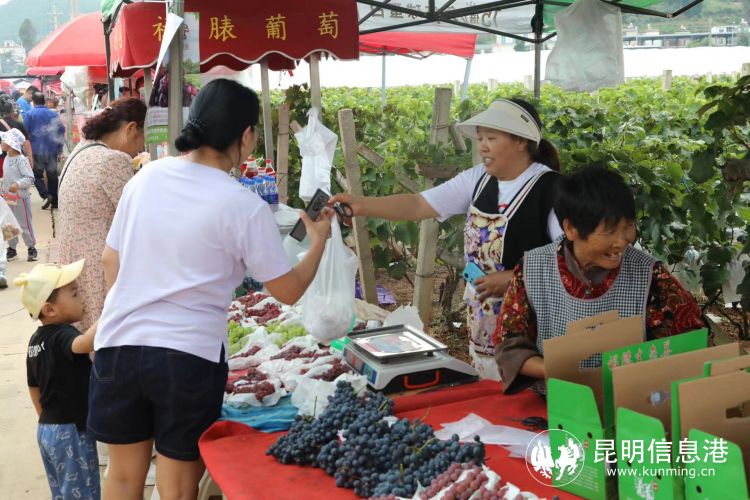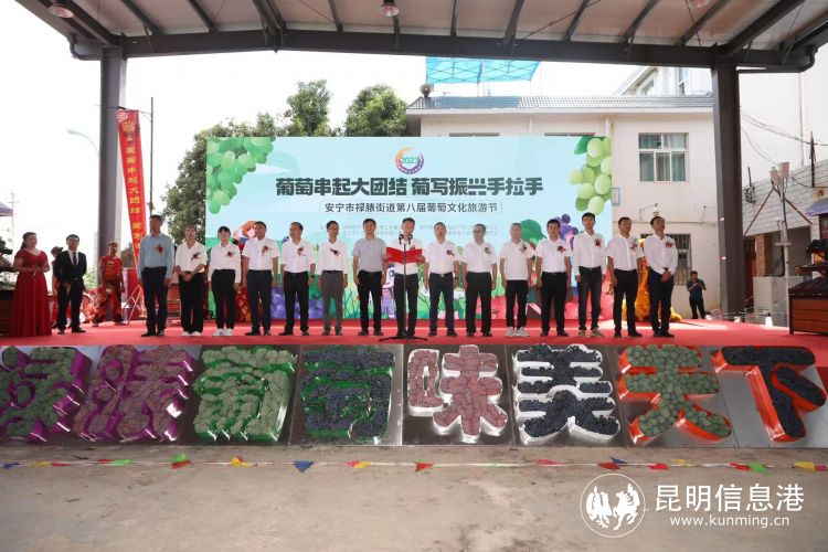 昆明信息港讯 记者杨雁 “葡萄串起大团结 ‘葡’写振兴手拉手”。7月22日,安宁市禄脿街道第八届葡萄文化旅游节在艾家营村委会启幕,来自四面八方的游客共赴禄脿,游美丽村庄、赏果园靓景、品葡萄美味、尝特色美食,与禄脿人民共赴一场“陶”醉一夏的葡萄盛宴。