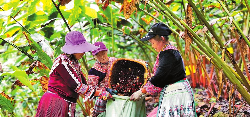 时下正是草果丰收的季节,马关县的山林间随处可见村民采收草果的忙碌身影。据了解,该县种植草果6万余亩,预计今年产量可达4500吨,农业产值可达1.7亿元。(云南日报记者 黄鹏 摄)