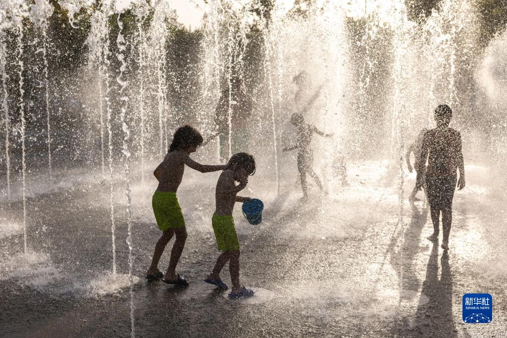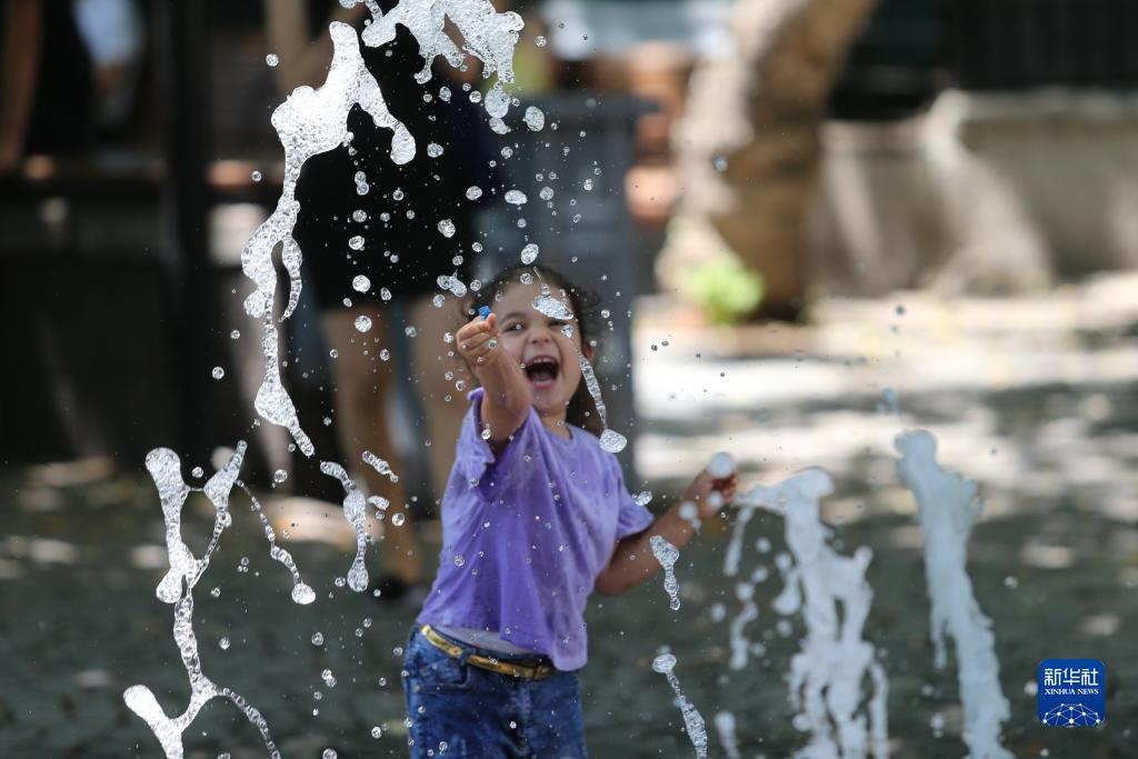 7月23日,儿童在希腊雅典一处喷泉玩水。新华社发(莱夫特里斯·帕察里斯摄)