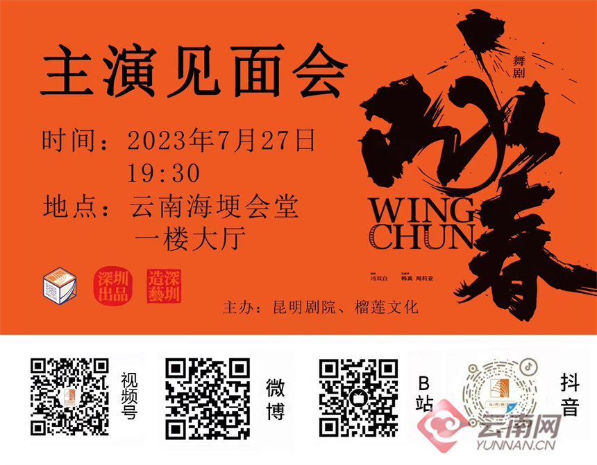 正式演出前,舞剧《咏春》昆明站将举行“主演见面会”,本次见面会将通过昆明剧院官方微信视频号、抖音、微博、b站同步直播,百余位热情观众可以相聚一堂,现场聆听主演畅聊舞剧台前幕后的故事。