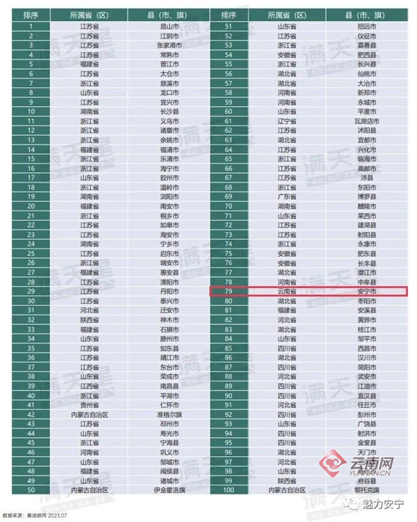 7月25日,赛迪顾问县域经济研究中心发布2023赛迪百强县榜单,安宁市蝉联上榜,排名第79位,是云南省唯一上榜的县(市)。