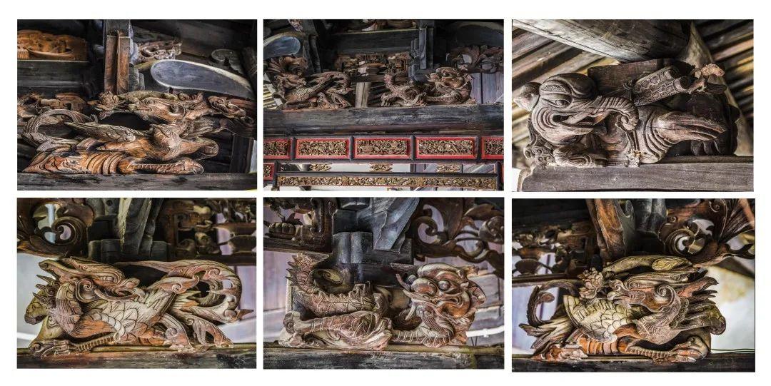 底层大厅门口一对青色抱鼓石,勒出如意锁、四龙戏珠等吉祥物,底部石础刻出神犬、青蛙等浮雕,凸显祈禳富贵幸福、子孙繁衍的寓意。