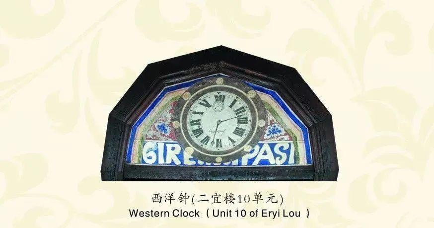 更为特别的是,二宜楼内第3、6、10三个单元阁楼内,彩绘壁画体现出浓郁的西洋风格。不仅墙上张贴有上个世纪三十年代外国的报纸,单元阁楼内还画有西洋彩绘和18面洋钟。有专家大胆推测:这些时钟彩绘很可能是当时世界各地的时差表。