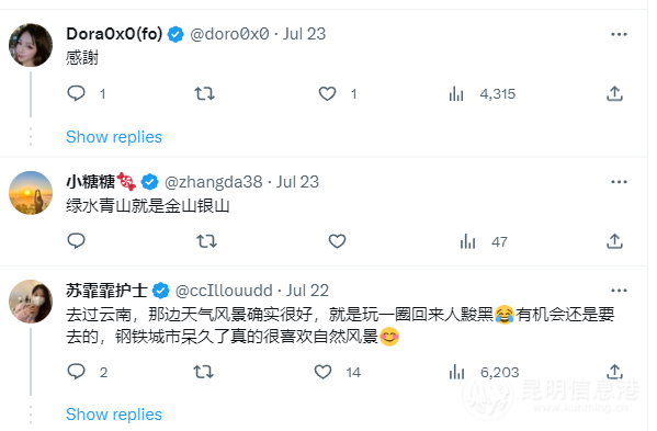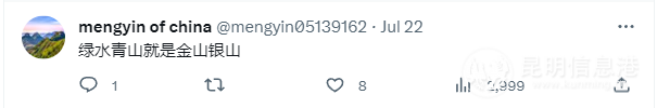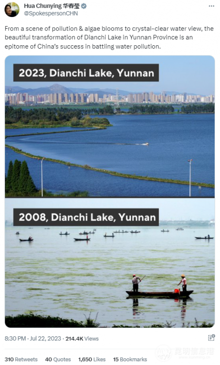 昆明信息港讯 记者石嘉欣 中国外交部部长助理、发言人华春莹7月22日在其推特公共主页上发帖,配以滇池2008年和2023年的对比照片,点赞称:“云南滇池的美丽改造是中国成功治理水污染的一个缩影。”截至目前已获得21.44万次浏览量、1650次点赞、310条评论和转发。