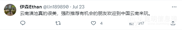 这一帖子立刻引起了大量网民的关注和热议,许多网民表示滇池景色美不胜收,中国绿色生态保护成效显著。网民评论:“绿水青山就是金山银山。”“云南滇池真的很美,强烈推荐有机会的朋友欢迎到中国云南来玩。”“中国对世界生态系统作出贡献。”“走过云南,那边天气确实很好。”