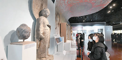游客在洛阳博物馆内参观龙门石窟流散文物数据聚合成果专题展。