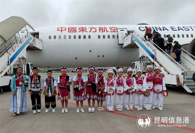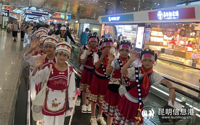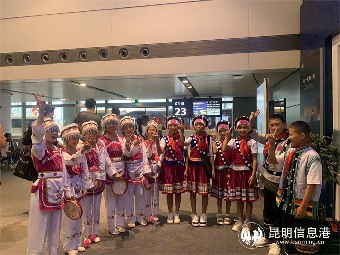 昆明信息港讯 记者江枫 通讯员邬志红 徐力为 7月27日7时许,昆明长水机场大厅迎来了一群身穿少数民族服装的孩子,他们聚在一起,高声欢呼“北京我们来了”,并表演了白族舞蹈《娘娘有个小公主》和傈僳族集体打跳等节目。