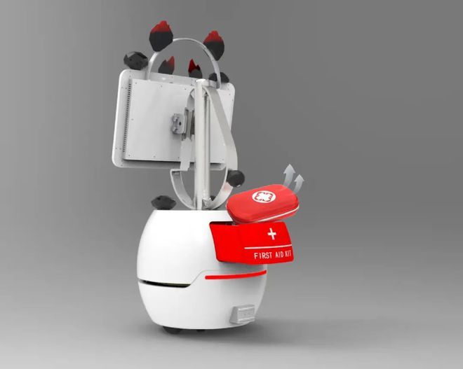 第一个出场的机器人是被称为“特殊服务生”的“蓉宝”机器人。它长什么样?上半身是吉祥物“蓉宝”的形象,火焰形状眼睛和耳朵,中间部分是一块电子显示屏,下半身是圆形的底座,是依据汉代石墩形象设计的。“蓉宝”机器人是带有应急功能的服务机器人,只要一点它后座上的按钮,就能弹出一个匣子,里面有心脏除颤器(AED)和急救包。一旦场馆内发生突发状况,就可以扫码唤来“蓉宝”机器人。在自动弹出急救包的同时,机身上那块屏幕可以播放示范视频,还能和医生进行远程连线,获得线上急救指导。“应急”是它最核心的功能,此外,引导带路、信息播报、语言翻译、远程呼叫、咨询对话等,它也无所不能。在大运会上,“蓉宝”机器人就是您身边的急救万能小助手。
