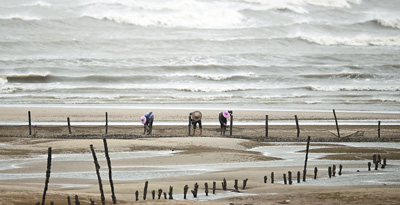 图为27日,福建福州市长乐区,渔民在海滩上抓紧收网上岸。新华社记者 魏培全摄