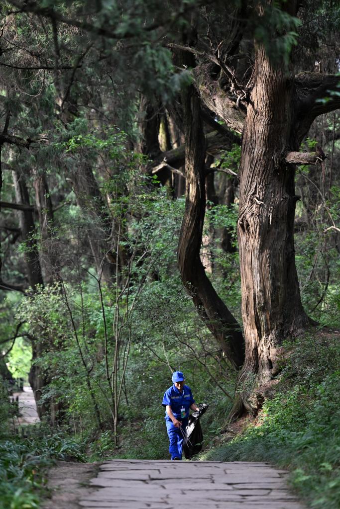 日前,一名清洁人员在四川省广元市剑阁县翠云廊景区捡拾枯枝落叶。新华社记者 刘坤 摄
