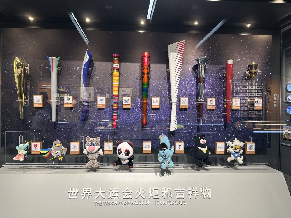 成都大运会博物馆内展示的世界大运会火炬和吉祥物