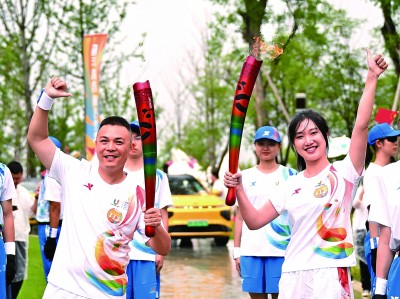 7月26日,火炬手叶德元(左)与陈凯迪在火炬传递中交接。新华社记者 胥冰洁摄