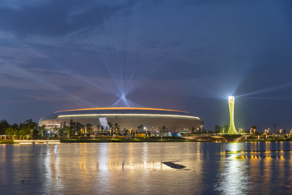 这是在成都市龙泉驿区拍摄的夜幕下的东安湖体育公园(7月18日摄)。新华社记者 黄伟 摄
