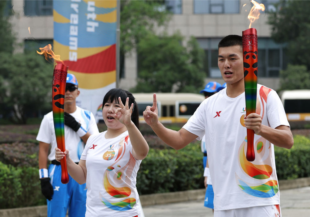 7月26日,大运会火炬手王政文(右)与陈丹在火炬传递中交接。新华社记者 骆学峰 摄
