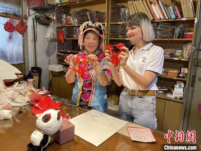 西安交通大学俄罗斯籍博士研究生安娜(右)正在拍摄有关成都非遗剪纸的视频。外国青年影像计划供图