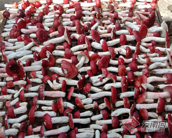 在南岭乡龙塘老寨的后山上,大红菌三天不采就会腐烂。自然生长的纯天然大红菌,生长期较慢,数量极少,采摘十分困难,因此,它也成了当地人一年当中最珍贵的等待。