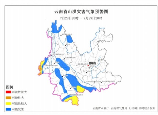 云南省水利厅、云南省气象局7月28日16时联合发布山洪灾害气象橙色预警:预计,7月28日20时至7月29日20时,伊洛瓦底江流域德宏州西部、澜沧江流域西双版纳州南部、红河流域普洱市东南部和红河州西南部地区发生山洪灾害可能性较大(黄色预警,Ⅲ级),其中德宏州西部局部地区发生山洪灾害可能性大(橙色预警,Ⅱ级),其它地区也可能因局地短历时强降水引发山洪灾害,请各地注意做好实时监测、防汛预警和转移避险等防范工作。(云南网 记者 段芃)