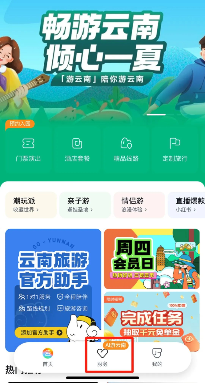 2. 微信搜索“游云南”小程序,进入后点击页面下方的“服务”按钮,体验AI服务。