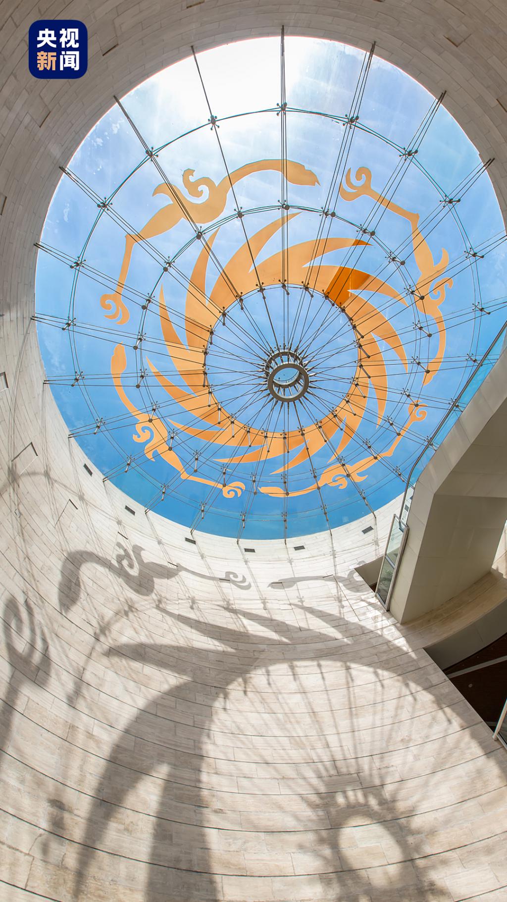 △绶带正反面主色分别为蓝色、红色,融入芙蓉花、太阳神鸟、棋盘格等元素,在自然光线下反射出不同的色彩。