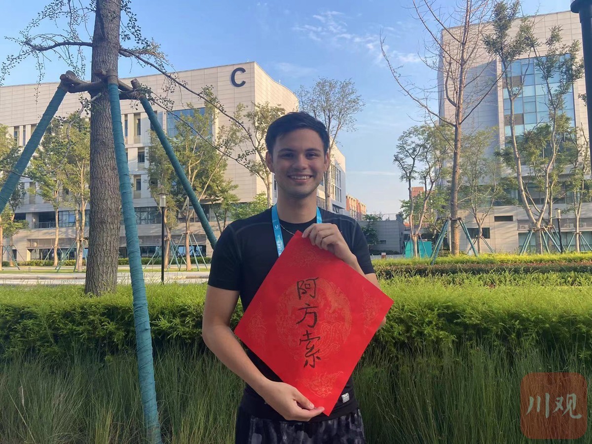 7月29日晚,成都大运村的非遗体验区里,意大利游泳运动员阿方索开心地拿着一张中国红春联纸,上面是他第一次用毛笔书写的自己的中文名字,他觉得中国书法很有意思,并期望这张红春联纸能为自己8月1日的比赛带来好运。