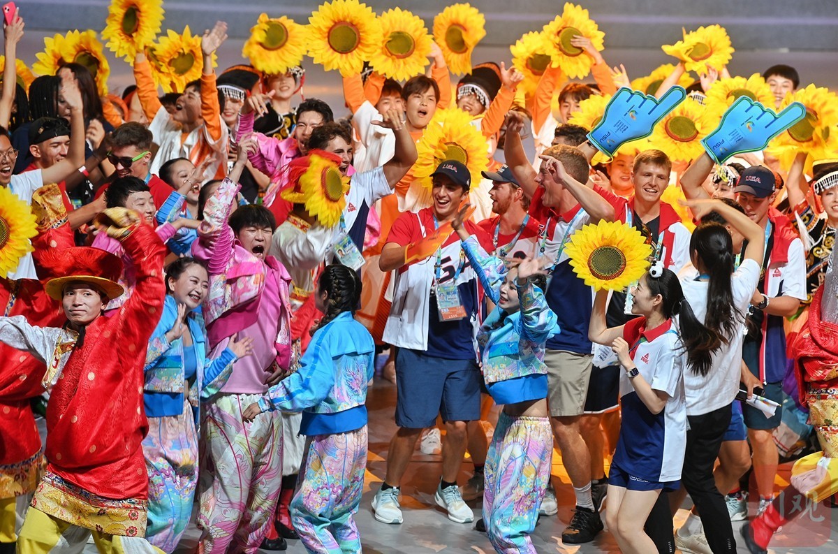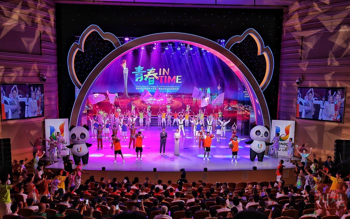 阿方索所在的非遗体验区,是抵达“青春IN TIME”——成都第31届世界大学生夏季运动会运动员联欢会(以下简称“联欢会”)活动现场的必经之路,沿途还有坝坝茶馆、文创中心、抚琴馆等。当晚,中外青年艺术家、运动员、大学生、志愿者代表等齐聚大运村艺术中心大剧场,举行联欢会。活动以国风、民乐、川江号子、武术、说唱、街舞、游戏、魔术、电声等多元形式,呈现传统与现代、东方与西方的文明对话交流。