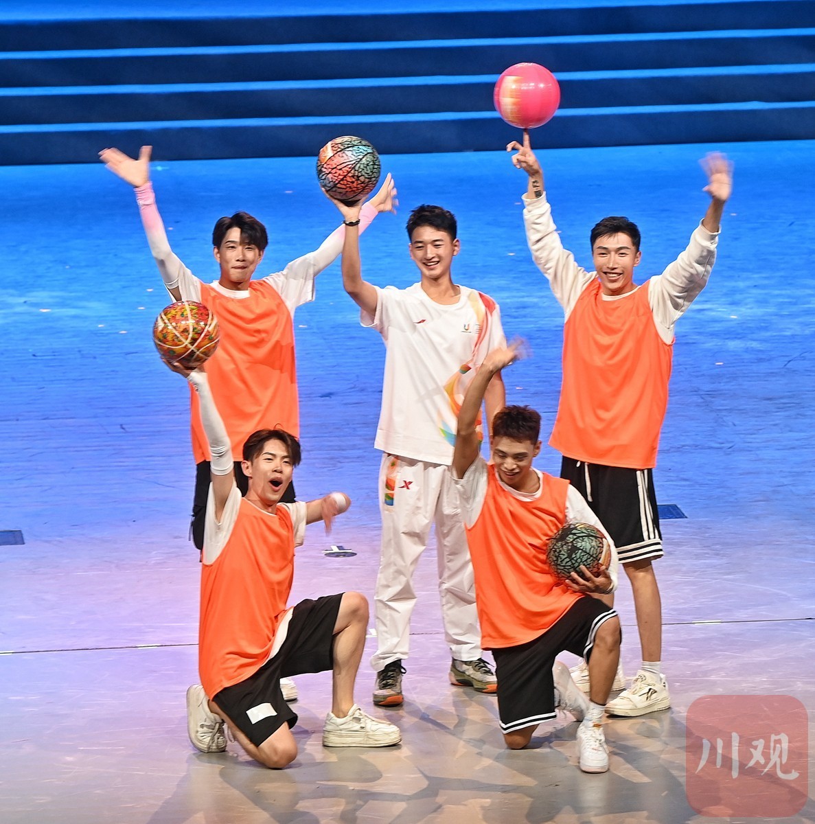 大运会是奥运冠军梦想的开始——张家齐和任茜两位奥运冠军还“跨界”合作,上台演唱了歌曲《梦想的冠军》。他们是青春梦想的代言人,两人也祝福参加比赛的健儿们能够赛出好水平,张家齐还用英语欢迎外国友人来成都玩耍。不久前获得北京大学录取通知书的敬礼娃娃郎铮,和演员们一起完成了一场篮球表演,展现着“阳光开朗大男孩”的本色。