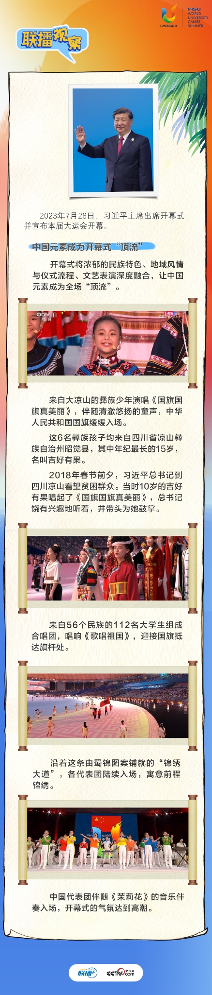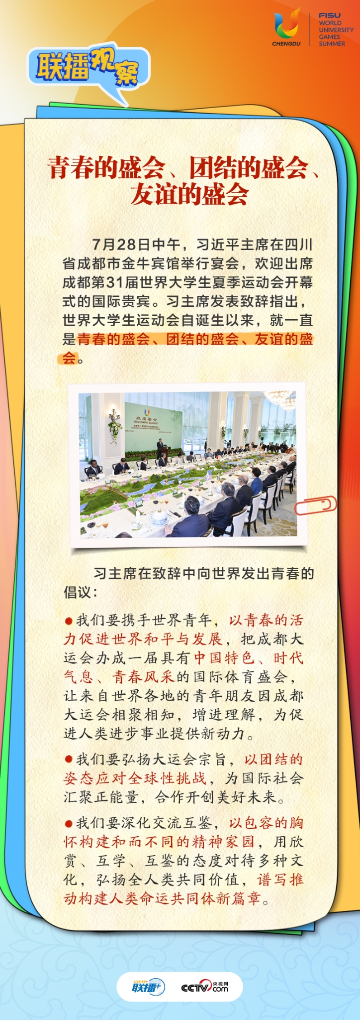 联播+ 7月28日晚,第31届世界大学生夏季运动会开幕式在四川省成都市举行。习近平主席出席开幕式并宣布本届大运会开幕。