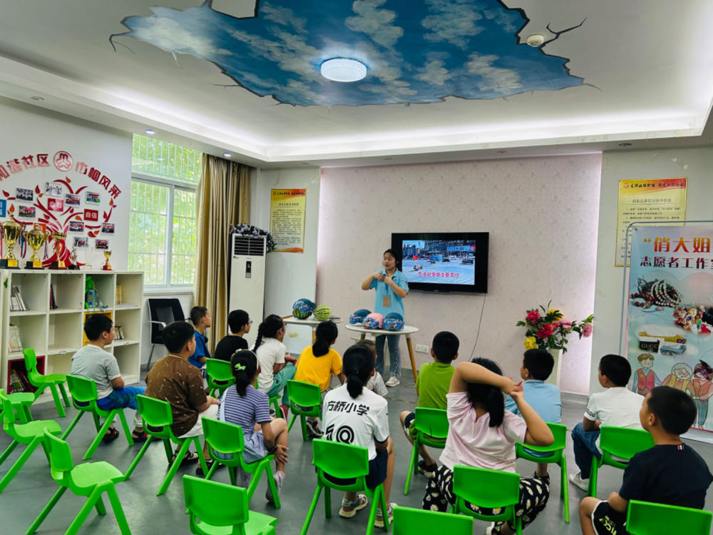 安徽省合肥市方桥社居委新时代文明实践站暑托班正在开展“一盔一带”安全教育。新华社记者周畅 摄