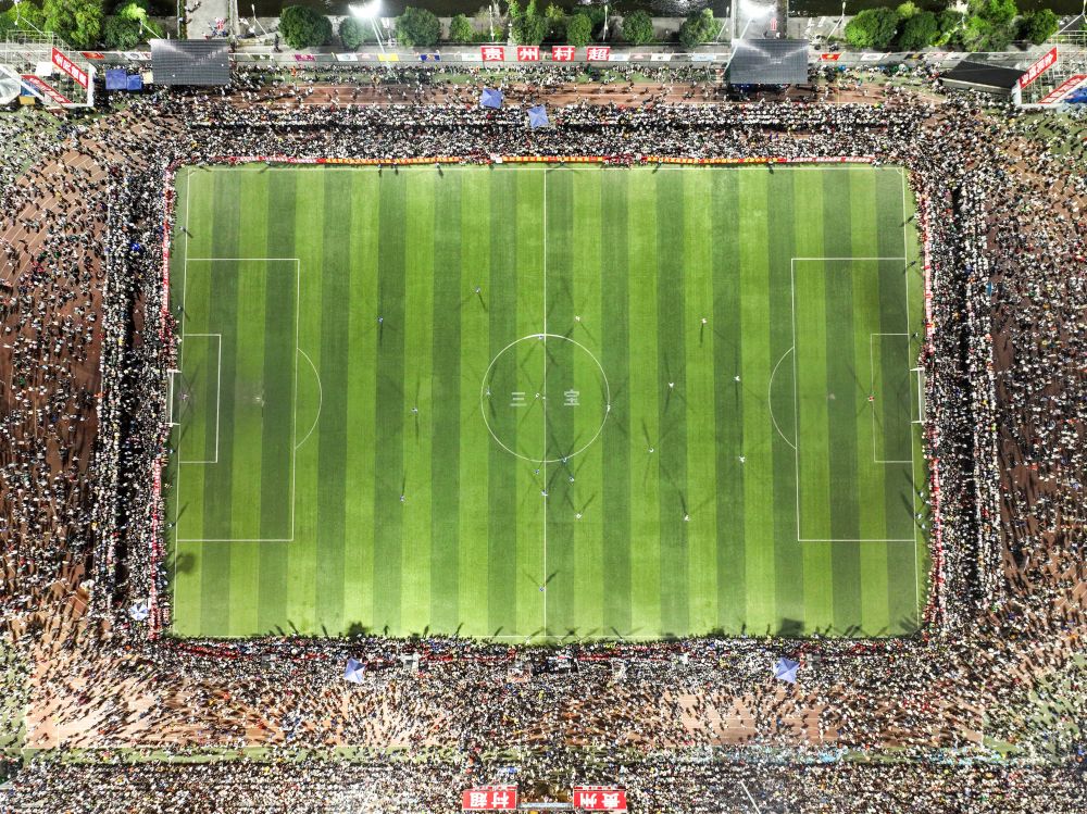 当天,距离比赛开球还有5个小时,球场内已是人山人海。开赛后,每当球员踢出一记好球,数万观众山呼海啸,还有啦啦队员敲击的锣鼓声和锅盆声,彰显乡村赛事的独特魅力。