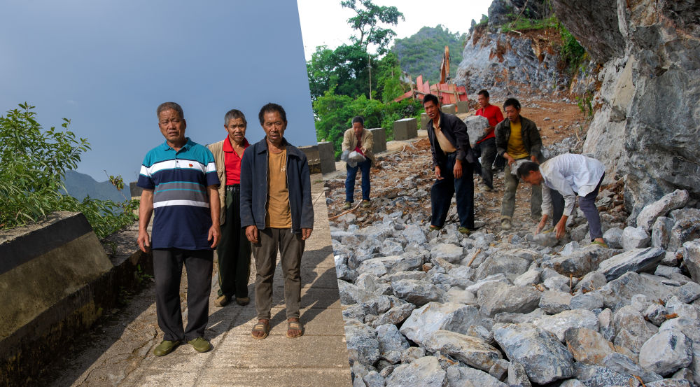 拼版照片:左图为2009年谢成芬(前左)带领村民一起修路时的资料照片(西畴县融媒体中心供图);右图为2023年7月27日,谢成芬站在修好的出村公路上(新华社记者 费茂华 摄)。