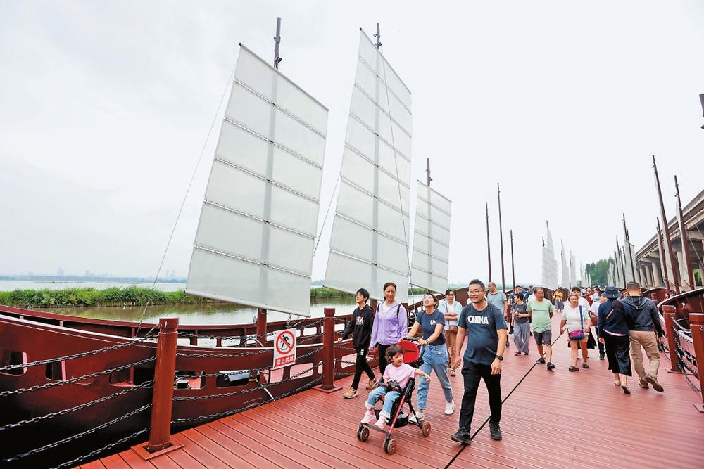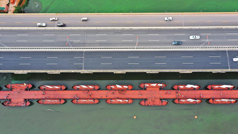 钢浮桥位于滇池绿道——环草海桥下空间段的一段涉水点。为了不损坏高速桥墩,浮桥采用水面架设的方式连通绿道,将昆明昔日高峣古渡的文化特色元素融入其中,呈纵向分置式排列,两边是帆船造型,中间铺设桥面,取百舸争流、千帆竞发之意。(云南日报 记者陈飞 龙舟)