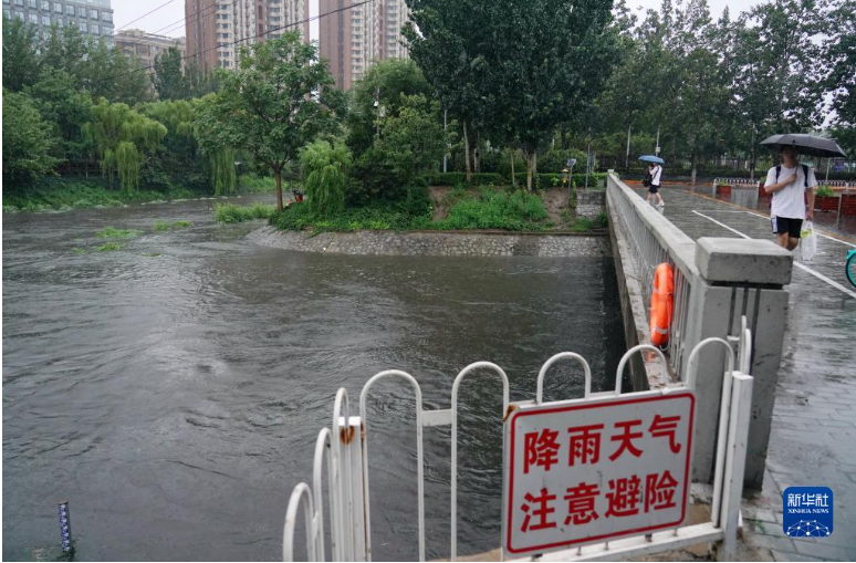 7月30日,在北京市凉水河周边,市民冒雨出行。新华社记者 张晨霖 摄