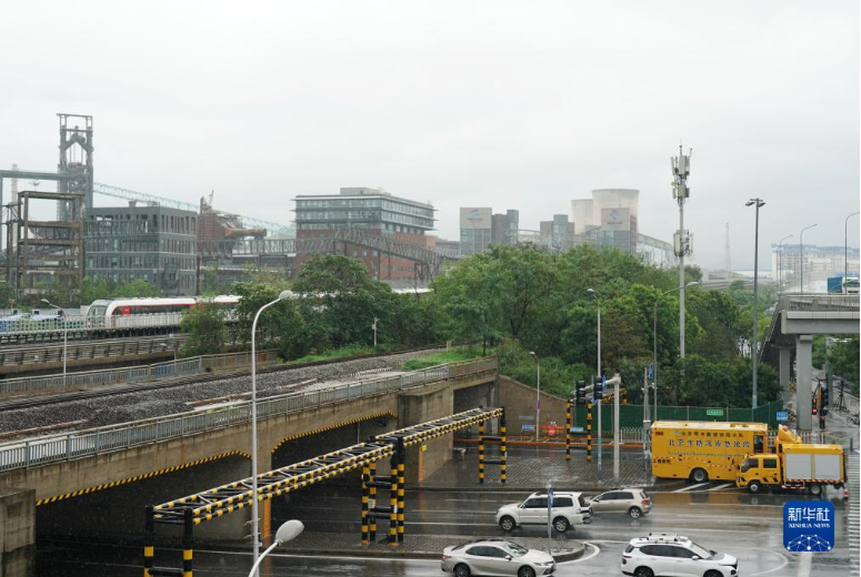 7月30日,在北京市石景山区金安桥附近,工作人员在值守应对可能形成的城市低洼地区积水。新华社记者 张晨霖 摄