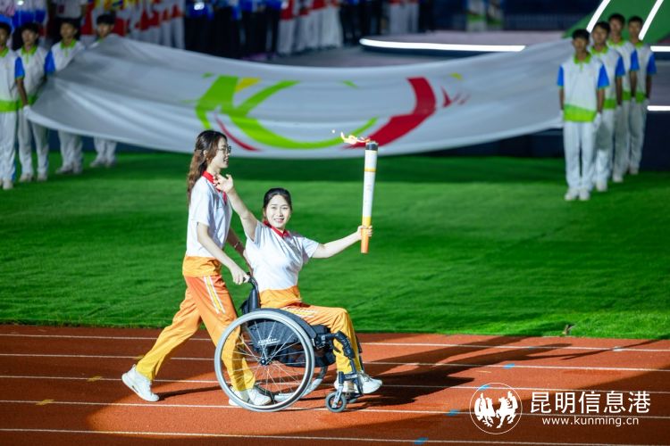 圣火传递环节,一只特意设计的凤凰飞跃球场上空,衔火而来,寻甸籍运动员——2021残奥会冠军周艳菲,接过凤凰口中的火焰,与寻甸县各行各业优秀代表接力传递,共同点燃运动会的圣火。一首激情洋溢、活力满满的《相约七运》拉开了文艺演出的序幕。演出分为《和美昆明 山水寻甸》《薪火传承 红色寻甸》《魅力春城 生态寻甸》《民族同心 金彩寻甸》《畅想昆明 寻梦未来》5个篇章,全方位展现了昆明寻甸热情好客、拼搏进取、展望未来的风采。