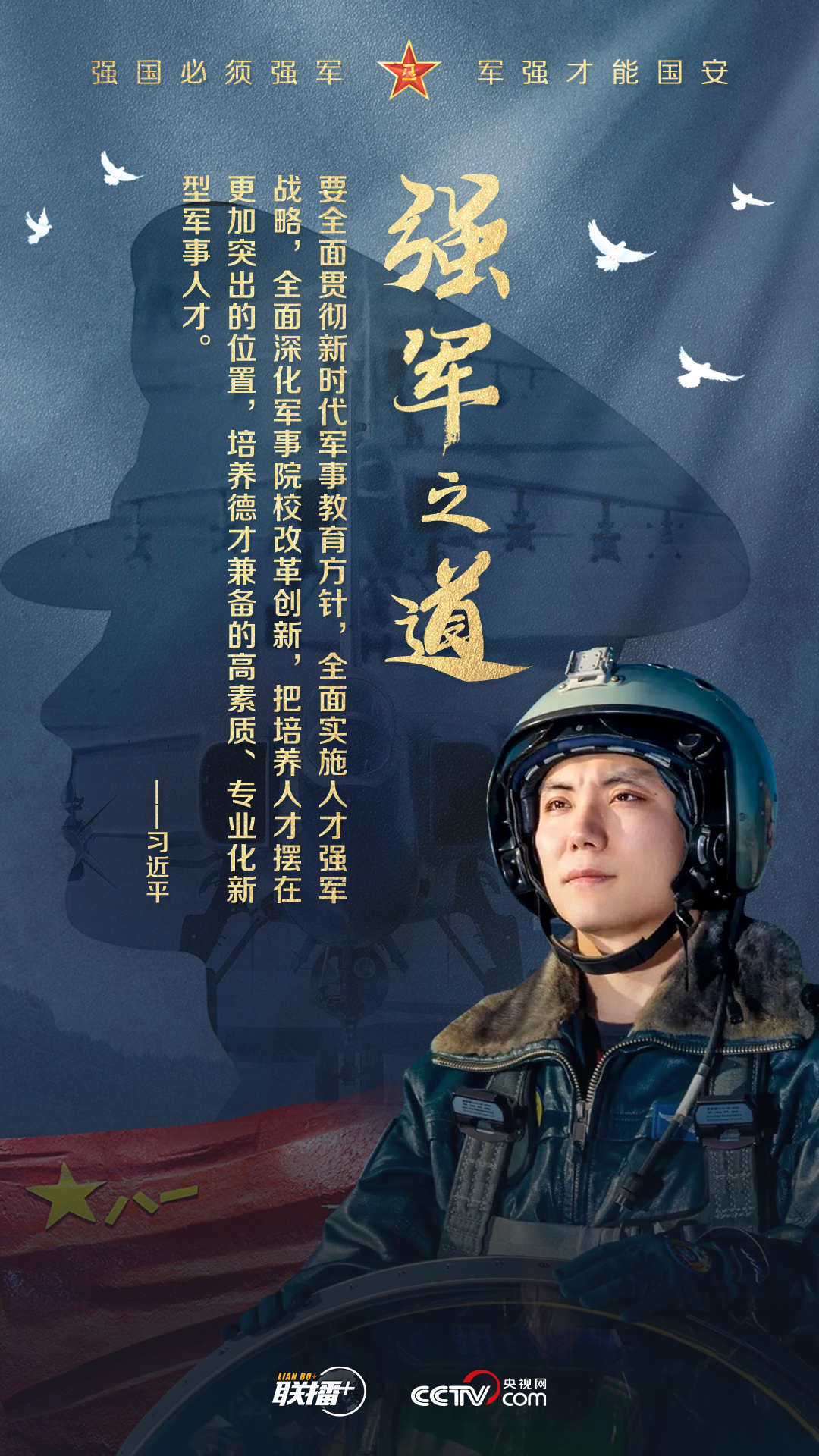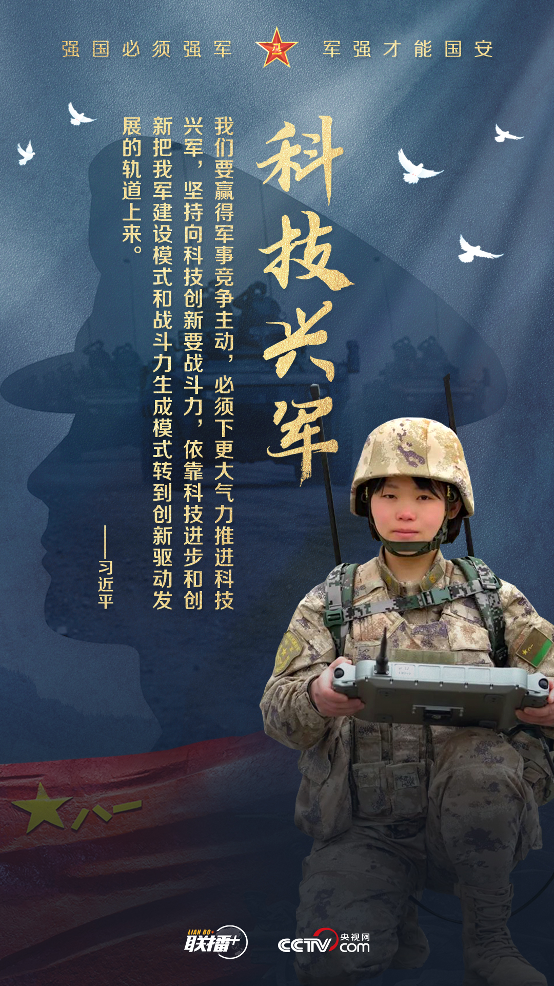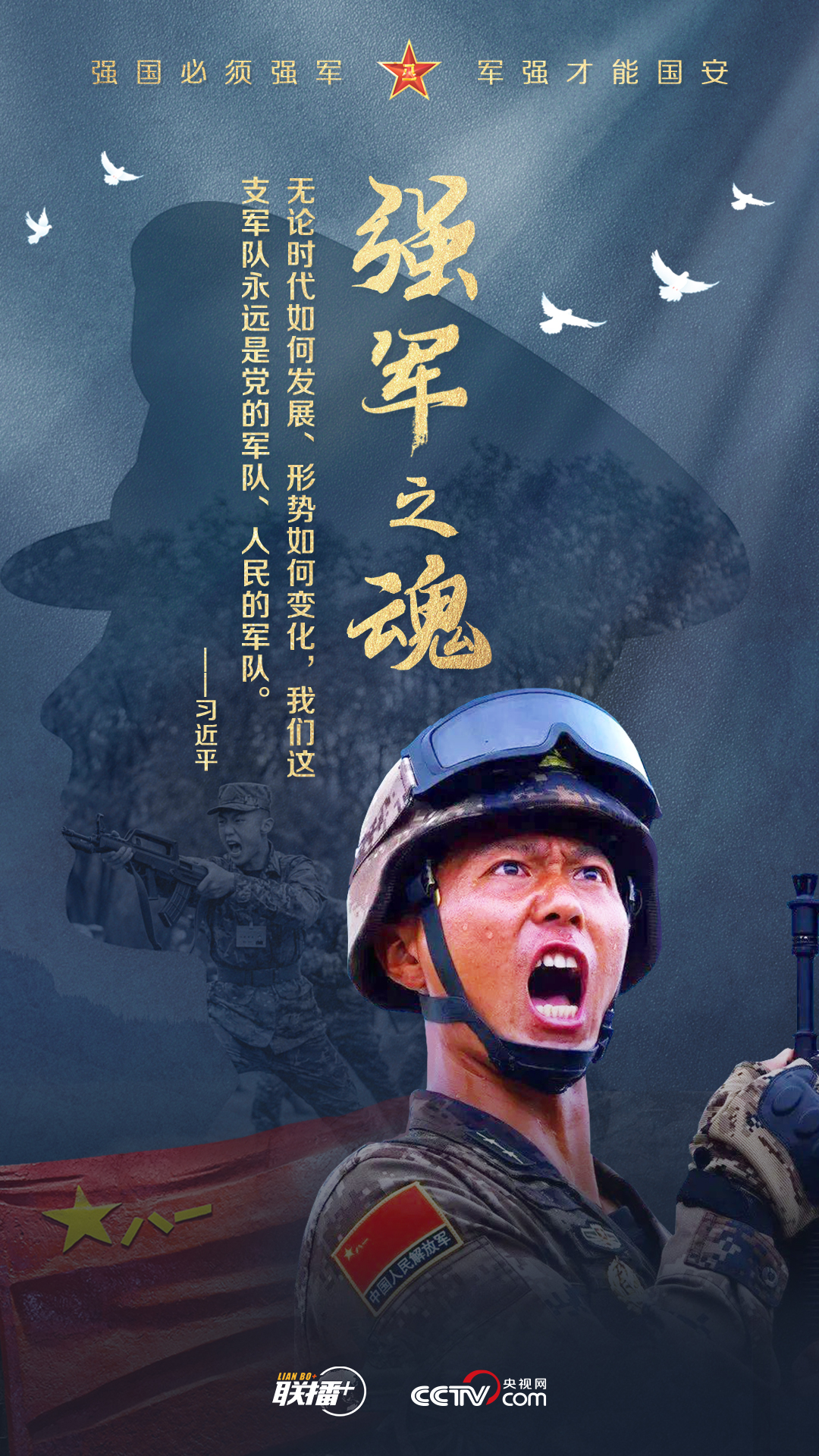 党的十八大以来,习近平主席始终高度重视国防和军队建设,为全军擘画强军兴军蓝图、指引奋进方向。值此中国人民解放军建军96周年之际,央视网《联播+》栏目制作强军海报,与您一起学习习主席的强军思想。