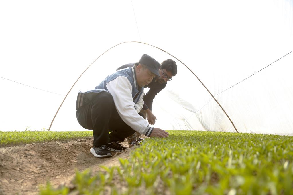 巴基斯坦旁遮普省木尔坦的中巴辣椒订单种植项目辣椒育苗大棚内,中国农业专家带领巴基斯坦技术员查看辣椒秧苗生长情况。