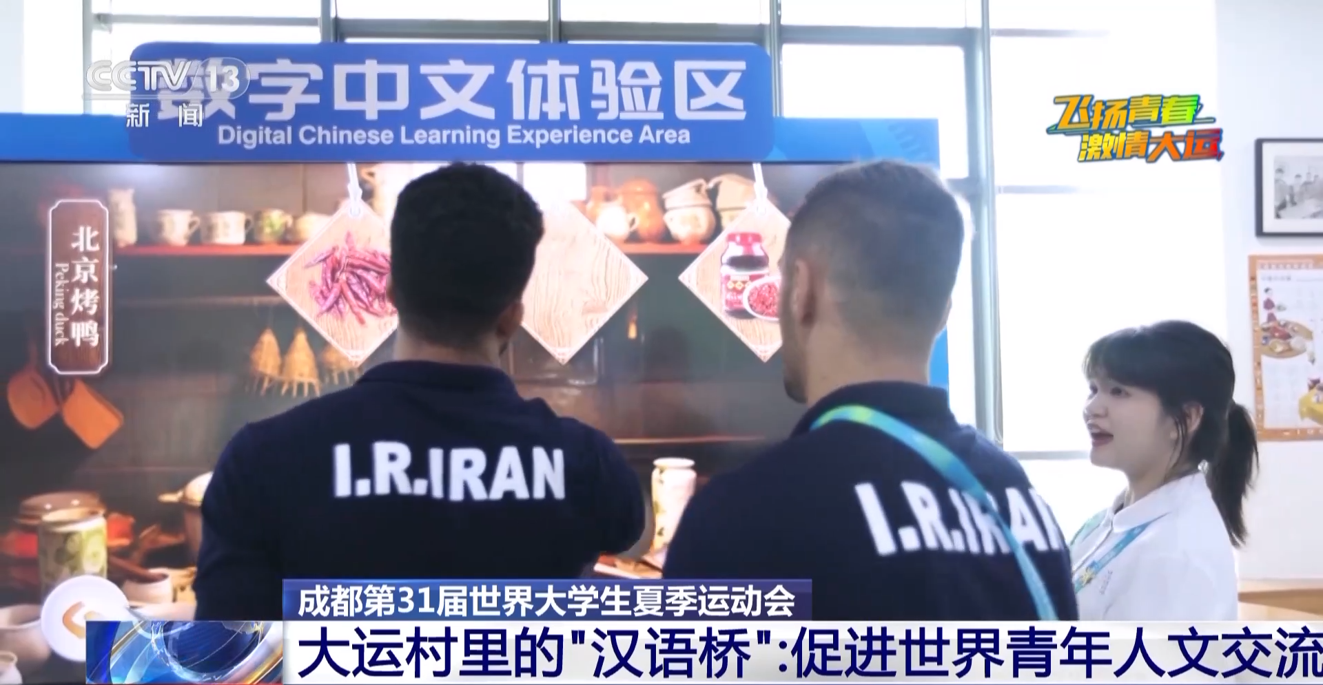 在“汉语桥”中文学习互动体验区,外国运动员们还能当一回大厨,虚拟制作北京烤鸭、宫保鸡丁等中国名菜;在合影区,当屏幕中心出现卡通熊猫的影像时,总会引来大家的惊叹欢呼。此外,唱中文歌、兑换成都当地大学徽章等环节,也吸引着外国运动员们一一打卡体验。大家在这里玩得尽兴,留下美好记忆,汉语桥也为世界青年学习中文和相互交流搭建起语言之桥、文化之桥、友谊之桥。(总台央视记者 李晶晶 魏帮军 曹宇)