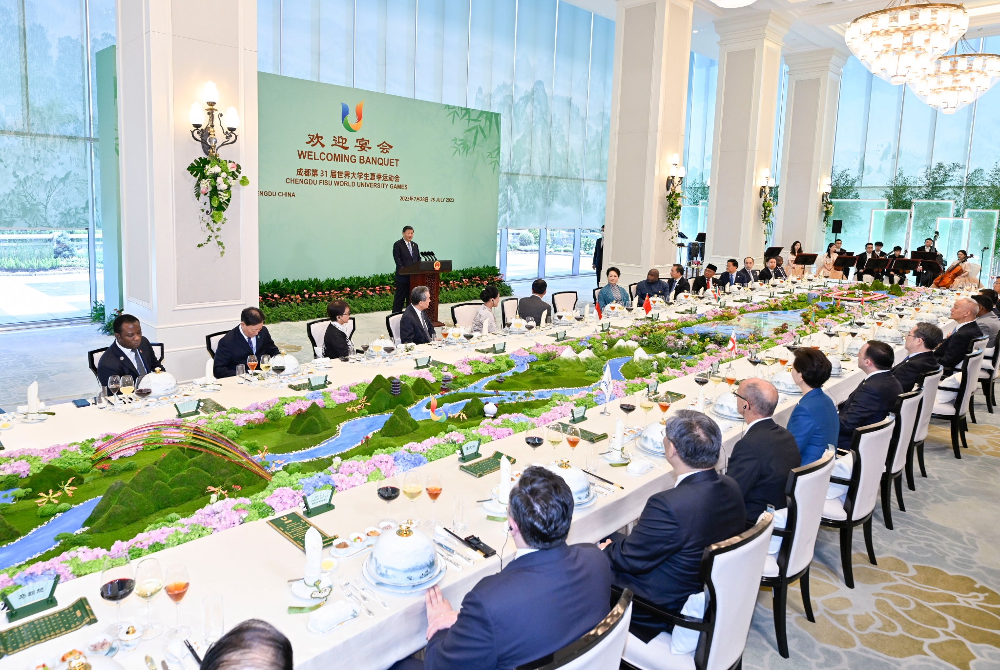 △2023年7月28日,国家主席习近平和夫人彭丽媛在四川省成都市金牛宾馆举行宴会,欢迎出席成都第31届世界大学生夏季运动会开幕式的国际贵宾。