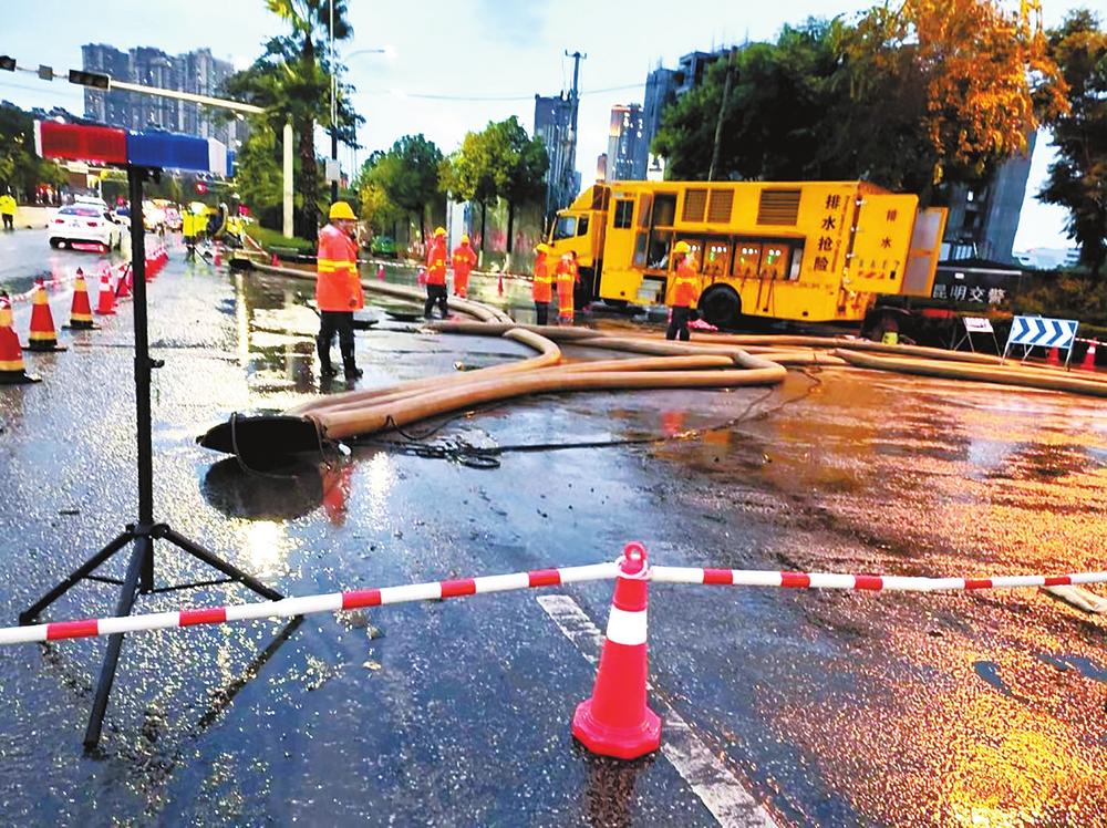 昆明市防汛指挥部全力防范应对强降雨,派出2个工作组深入一线,督导防汛排涝工作;昆明市排水公司派出防汛抢险队员701名、应急抢险车135辆、应急处置设备45台(套)辆参与处置。同时,昆明市防汛指挥部提前调度闸门泵站,同步调度海明河闸、明通河闸、麻线沟闸,对水质净化厂开展一级强化调度。