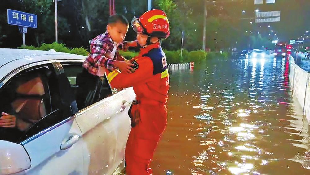 昌源路 消防员转移被困群众(昆明市消防救援支队供图)