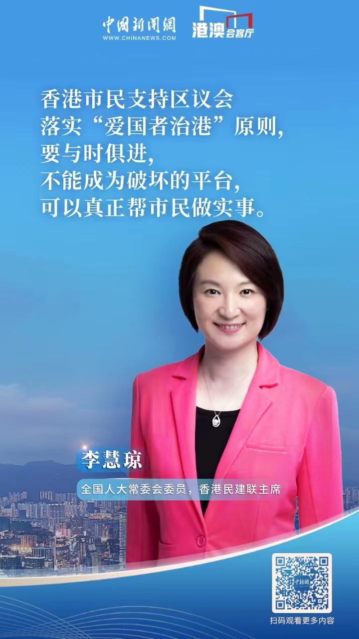 李慧琼:“落区”推介完善地区治理,我认为(收到的)反应很好。主要我都是分享自身经历。因为我作为区议员超过二十年了,其实很能感受到地区治理过去的一些发展变化和不足的情况。通过自身分享,大家也都同意区议会要与时俱进,最重要的是要落实“爱国者治港”,不可以让区议会成为一个破坏的平台。另一方面,我想大家都很触动(的)就是希望区议会真是可以帮到市民做到实事。