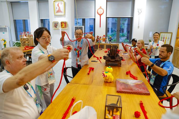 7月31日,在成都大运村,成都新津绳编市级非物质文化遗产传承人杨文艺(左三)展示如何制作中国结。新华社记者沈伯韩摄