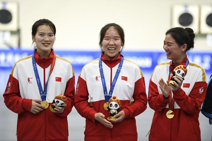 8月1日,中国队选手熊亚瑄、林雅茜、王珂怡(从左至右)在颁奖仪式上庆祝。当日,在大运会射击项目女子25米手枪团体赛中,中国队获得冠军。新华社记者曹祎铭摄