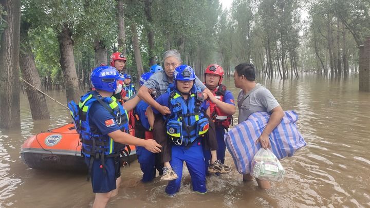 8月4日,在河北省涿州市汛情重灾区码头镇沙窝村,贵州蓝天救援队队员在转移受困村民。新华社发