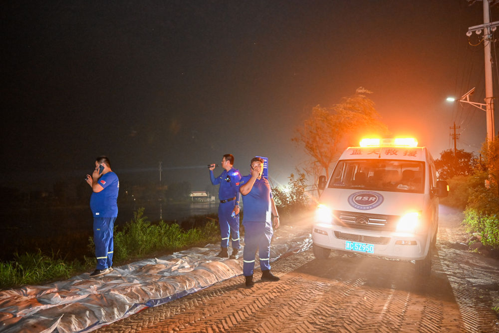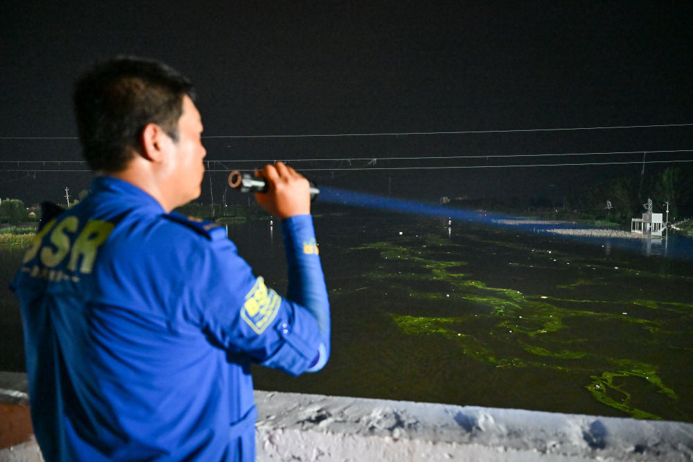 ↑8月4日,天津静海蓝天救援队队员在天津市静海区台头镇革命桥上观测桥下洪水情况。