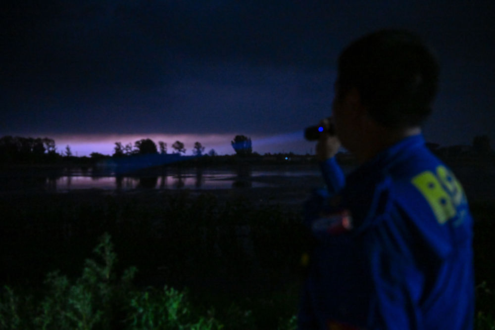 ↑8月4日,在大清河天津静海段北堤,天津静海蓝天救援队队员夜间巡堤时发现隐患点后,通过灯光指引南堤队员现场查看。