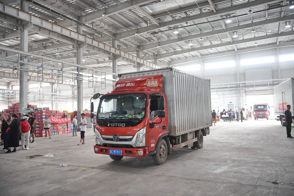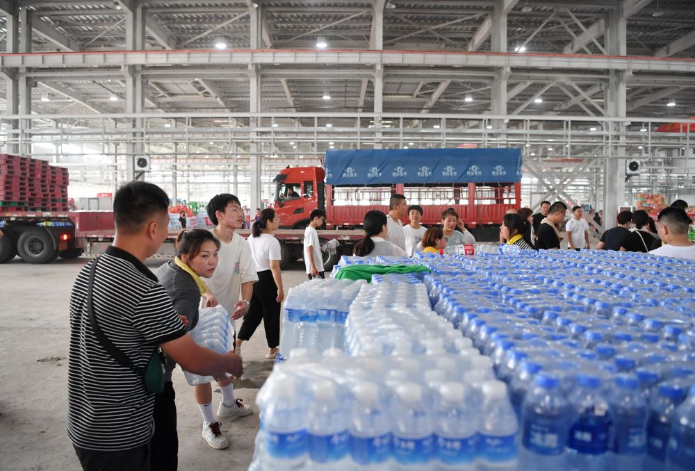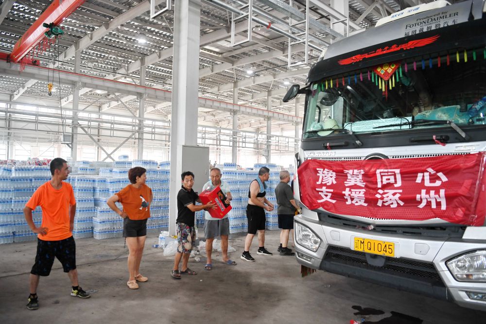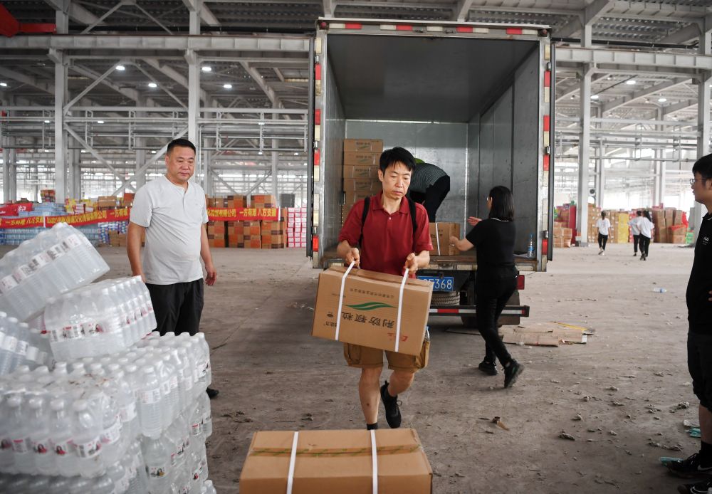8月5日,大批来自全国各地的捐赠物资运抵河北涿州,支援当地受灾群众。(记者牟宇)