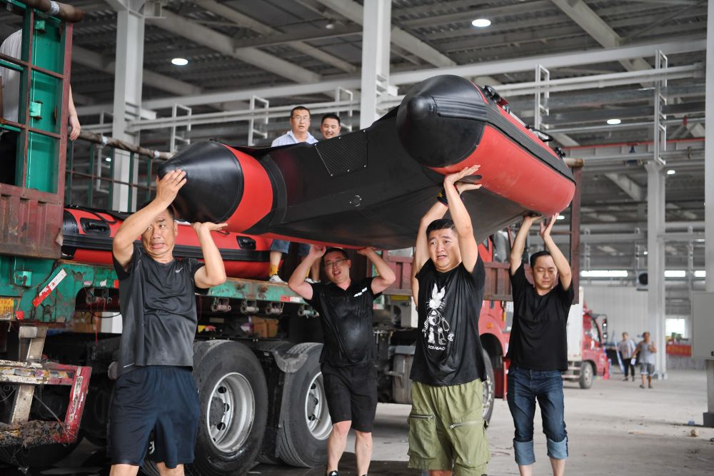 ↑8月5日,工作人员和志愿者在河北省涿州市钢研物资储备点内搬运捐赠的冲锋舟。