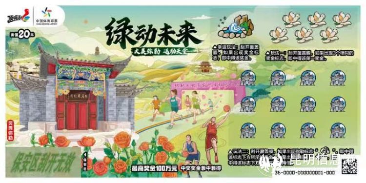 据了解,该款彩票面值为20元,最高可中100万元,是一款代表云南弥勒地区特色的即开票,也是云南发行的第六款地方主题即开型体育彩票。票面共有四个画面,分别是“运动弥勒”“风情弥勒”“灵秀弥勒”“生态弥勒”,票面设计以手绘插画的形式,展现了弥勒在体育赛事、民族风情、人文历史、地域文化四个方面的特色。“绿动未来”第一期发售规模为3600万元,将同步在全省9000多个网点销售。