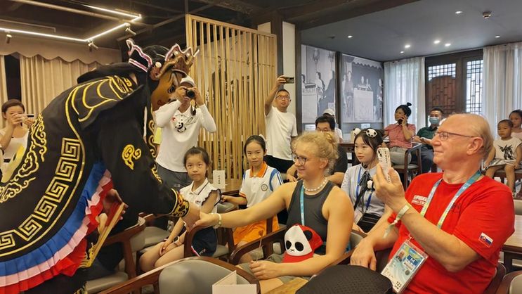 成都糖画、蜀绣技艺、剪纸棕编、曲艺变脸……在体验过一系列非遗展演等活动后,来自斯洛伐克队的医生ZIGO Pavel说,“中国文化传承了几千年,这很厉害!”在参观体验过程中,他和来自意大利的游泳运动员LAQUINTANA Sonia兴奋地和非遗传承人合影,想要把这美好的瞬间留存下来。“我们来自欧洲,今天的体验对我们来说很有趣。”ZIGO Pavel说,“成都的气氛非常好,人也非常好。”